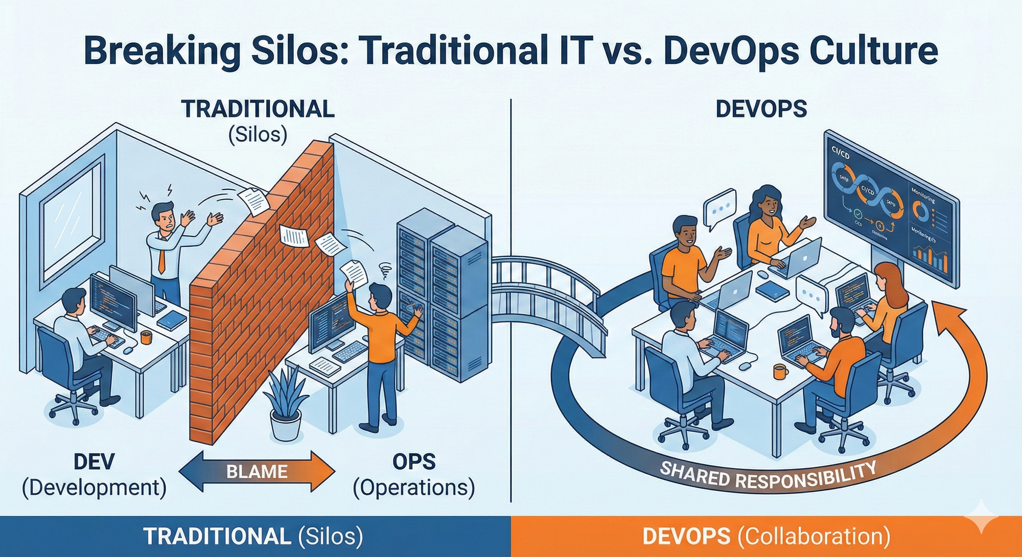 과거에는 개발팀이 코드를 던지면 운영팀이 그것을 받아 운영 환경에 배포하고 안정성을 책임지는 구조였습니다. 서로의 영역에 대한 이해가 부족했고, 문제 발생 시 책임 공방이 벌어지기도 했습니다. DevOps는 이러한 '사일로'를 깨고, 기획 단계부터 배포, 모니터링까지 모든 과정을 함께 고민하고 책임지는 문화를 지향합니다.